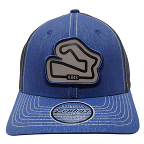 A cap with a structured mid-profile of blue and black polyester in the front, has matching lid and eyelets blending through the breathable soft mesh side and back. It hosts a curved visor, plastic snapback closure, and comfort sweatband. The Jayden Hat features an embroidered track outline. High quality cap made by Zephyr. Browse Road America's Paddock Shop for more racing themed hats and caps. Makes a perfect birthday or holiday gift for the race fan in your life!