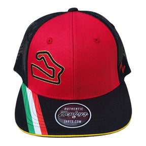 Shop Road America's Paddock Shop for more hats and caps like this. Bold Colors of red, white, and green. Black mesh with snap back closure. The Lorenzo Hat features the Road America Track in black with yellow stitching. Quality made by Zephyr.